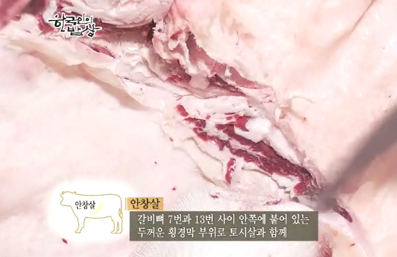 갈빗대 근처에서는 특별한 맛을 내는 부위들이 많습니다. 갈비 안쪽에 붙은 ‘안창살’은 두꺼운 횡경막 부위로 ‘토시살’과 함께 내장을 붙들고 있는 근육으로 쫄깃하게 씹히는 촉감과 독특한 단맛을 가지고 있습니다. ‘제비추리’는 흉추의 안쪽을 따라 길게 붙어 있는 띠 모양의 근육살로서 그 모습이 제비가 날개를 편 것 같이 날씬하고 길다고 하여 붙여졌습니다. 소 한마리에서 얼마 나오지 안아 귀한 부위로 기름기가 적어 쫄깃하고 담백한 맛을 냅니다. ‘토시살’은 팔에 끼는 토시를 닮아 이름이 붙여졌습니다. 갈비 안쪽에 붙어 있는 두꺼운 횡격막 부위로 부드러우며 소고기의 가장 원초적인 맛을 지니고 있습니다. 소 한마리에 한 주먹밖에 나오지 않아 귀한 고기입니다.