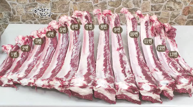 갈비는 13대로 이루워져있는데 이 중에서도 5,6,7번이 가장 맛이 좋습니다. 고기 표면에 눈꽃모양도 뛰어나고 뼈에 붙어있는 살도 훨씬 많기 때문입니다.