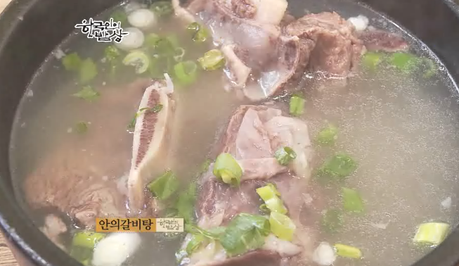 ‘안의갈비탕’은 매일 아침 갈비가 들어오면 그 날 그 날 끊입니다. 끊는 물에 갈비 넣고 살짝 삶아서 건저서 찬물에 빡빡씻습니다. 그럼 잡내도 잡고 고기가 갈비대에서 떨어져 나가는 것도 막을 수 있다고합니다. 그리고 다시 솥에 갈비넣고 물 부어서 3시간을 삶습니다. 그리고 갈비는 건져서 고기에 남아 있는 기름기를 다 떼어냅니다. 그리고 뚝배기 갈비 넣고 육슈 넣고 파송송해서 담깁니다.