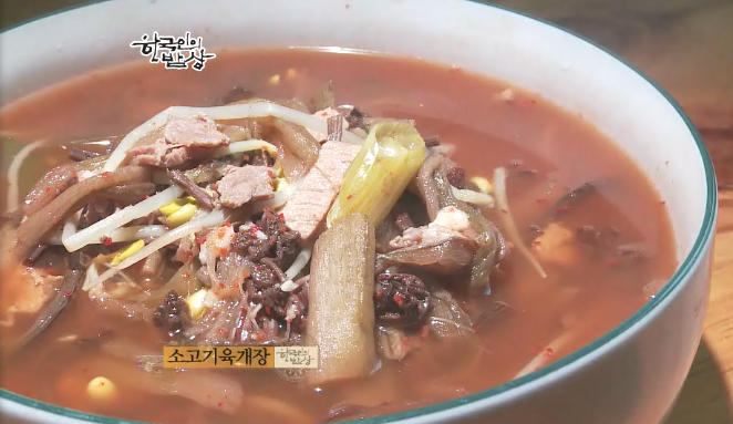 ‘소고기육개장’은 더운철 원기회복에는 육개장이 최고랍니다. 양지를 먹기좋게 썰어 끊는 물에 넣어 육수를 낸다음 콩나물, 고사리, 토란대를 넣고 시원하고 얼큰하게 끊여먹습니다. 예전에 고기가 귀할 때 고깃국으로 다같이 나눠먹었다고 합니다.