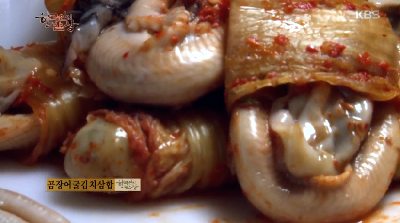‘곰장어굴김치삼합’은 끓는 물에 산곰장어를 넣고 삶아 껍질을 벗기고 쓸개를 떼냅니다. 묵은지에 곰장어 올리고 굴을 올려서 먹습니다.