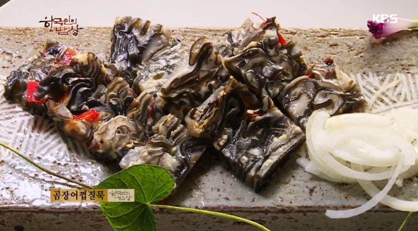 ‘곰장어껍질묵’은 곰장어 껍질을 세 번 이상 씻어서 진을 빼줍니다. 생강, 실고추, 곰피 우린 물 등을 넣고 잘 버무려서 팬에 넣고 볶아줍니다. 그리고 틀에 넣고 밑에 얼음물(더 졸깃해짐)을 대서 굳힙니다. 그리고 먹기 좋게 잘라 초장에 찍어먹습니다.