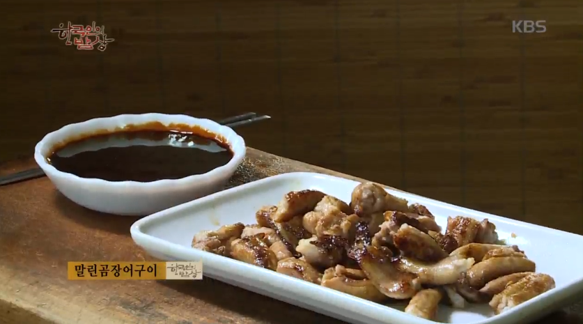 ‘말린곰장어구이’는 살아있는 곰장어에 굵은 소금을 넣고 잘 비벼서 진을 걸러냅니다(물로 씻으면 진액이 계속 나와 물로 안씻음). 그리고 껍질을 벗겨서 반나절 말려줍니다. 그리고 팬에 기름을 두르고 구워줍니다.
