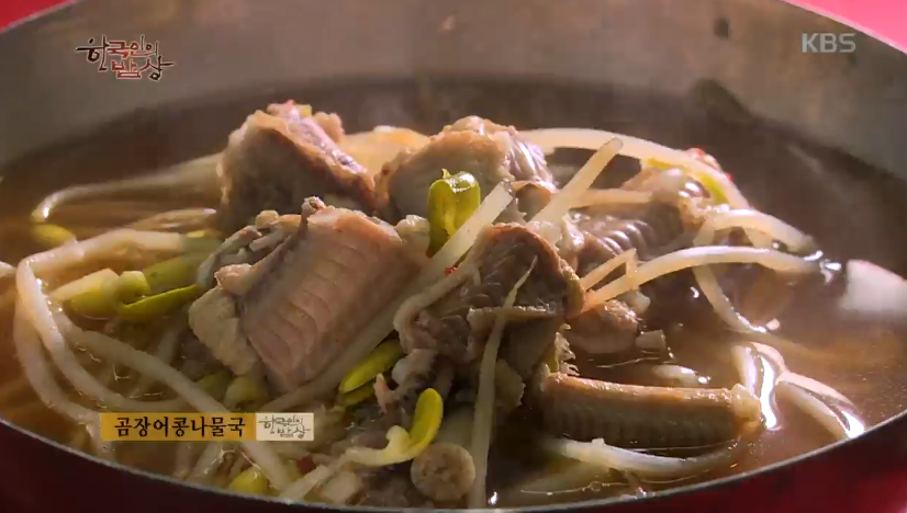 ‘곰장어콩나물국’은 끓는 물에 된장, 고춧가루, 다진파 등을 넣고 끓이다가 곰장어, 콩나물을 넣고 끓입니다.
