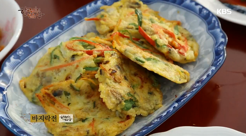 ‘바지락전’은 부침가루에 당근채, 오이채, 고추채, 계란 등을 넣고 바지락을 넣고 잘 섞어서 팬에 기름을 두르고 한수저씩 떠서 넣고 부쳐줍니다.