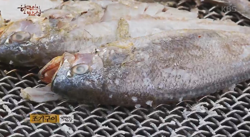‘조기구이’는 조기의 지느러미를 다 잘라 손질을 하고 소금을 뿌린 뒤에 숯불에서 구워줍니다. 먹을줄 안다는 분들은 머리부터 먹는데 조기는 머리 속에 돌맹이만 빼고 다 먹을 수 있습니다.