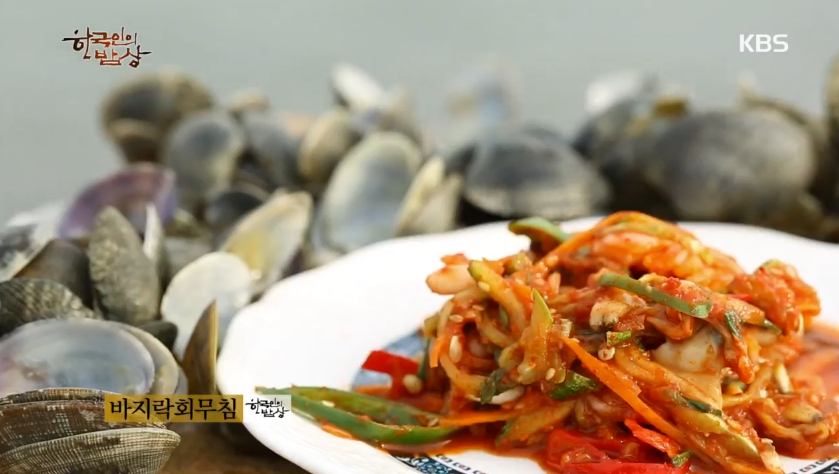 ‘바지락회무침’은 바지락 살을 바르고 고추, 당근, 오이 등을 채썰어 넣고, 다진마늘, 쪽파송송, 고춧가루, 깨소금 등으로 양념을 해서 무쳐줍니다.