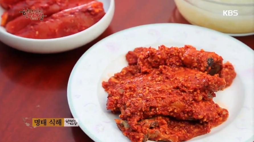 ‘명태식해’는 명태를 머리를 떼고 내장을 손질해서 반을 갈라 뼈를 바르고 굵은 소금을 잔뜩 치고 3일을 절입니다. 그리고 물에 씻어 토막을 내고 고춧가루, 다진마늘, 다진생강, 삶은 조를 넣고 잘 섞어줍니다.