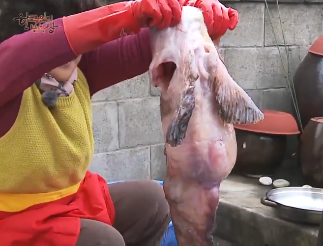‘곰치알국’은 밀어서 껍질 벗기고 손질을 하고 내장은 따로 다 분리 해두고 토막을 내서 물을 끓이고 무를 나박하게 썰어 넣고 내장을 알과 함께 다 넣고 묵은지를 넣고 푹 끓이다가 토막낸 살을 넣고 조심히 저으면서 한소끔 끓입니다.