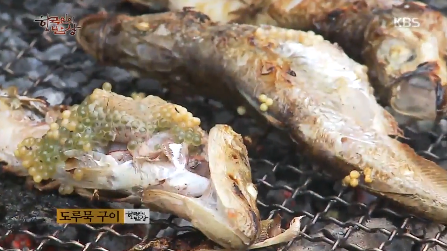 ‘도루묵구이’는 머리와 내장 손질을 해서 말린 도루묵을 석회에 올려서 숯에 올려 구워먹습니다. 그리고 알배기 도루묵도 같이 구워줍니다.