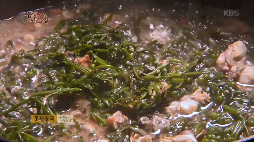 ‘톳된장국’은 끓는 물에 톳을 데쳐 찬물에 씻어줍니다. 그리고 찬물에 톳을 넣고 된장을 풀어주고 깜장굴을 넣고 끓입니다.