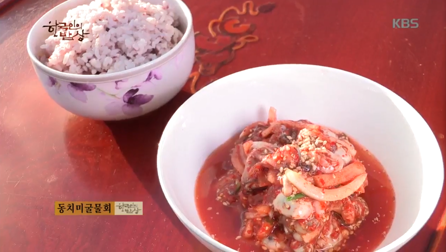 ‘동치미굴물회’는 무채, 고춧가루, 다진파 등을 섞은 뒤에 굴을 넣고 잘 무쳐줍니다. 그리고 동치미국물을 부어줍니다. 그리고 따뜻한 밥에 비벼도 먹습니다.