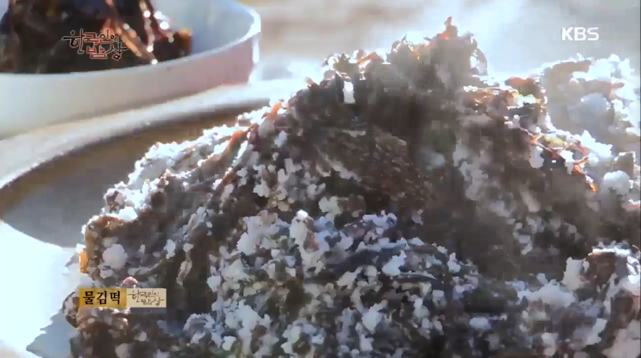 ‘물김떡’은 물김에 쌀가루를 섞어서 찜통에 넣고 찝니다. (물김은 오래 보관하면 바라 상해서 김채취하는 분들 아니면 먹기 힘듬. 날이 궃으면 말리지도 못하고 썩음.)