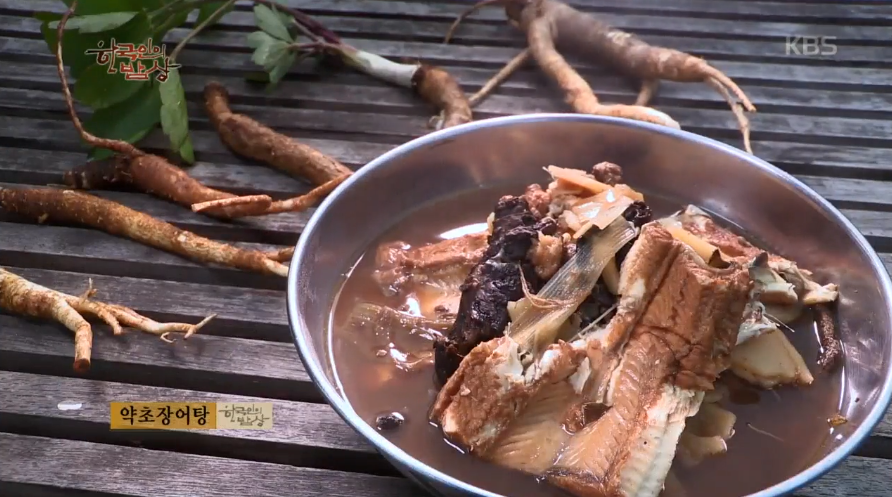 ‘약초장어탕’은 토화삼(도라지를 캐서 아홉 번 찌고 아홉 번 말린 것.)을 물에 넣고 우려서 말린 장어를 넣고 도라지, 더덕, 방풍, 파, 감자 등을 넣고 푹 끓입니다.