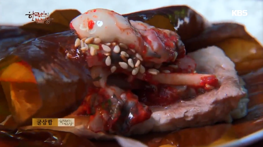 ‘굴삼합’은 삼겹살을 굽고 굴무침과 물미역을 싸서 먹습니다.