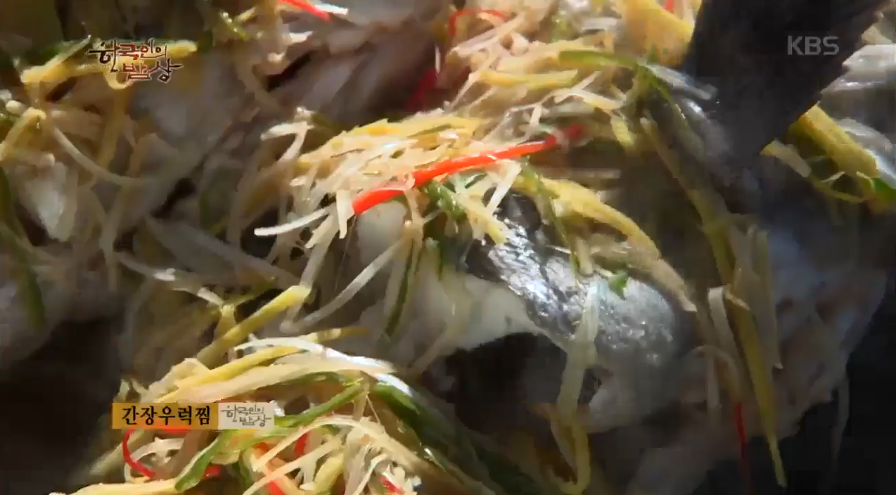 ‘간장우럭찜’은 간장을 끓여서 식히고 파, 생강, 당근, 무 등을 채썰어 간장과 섞어 줍니다. 그리고 우럭을 손질해서 칼집을 내고 찜통에 넣고 그위에 양념한 야채를 올려서 찝니다.