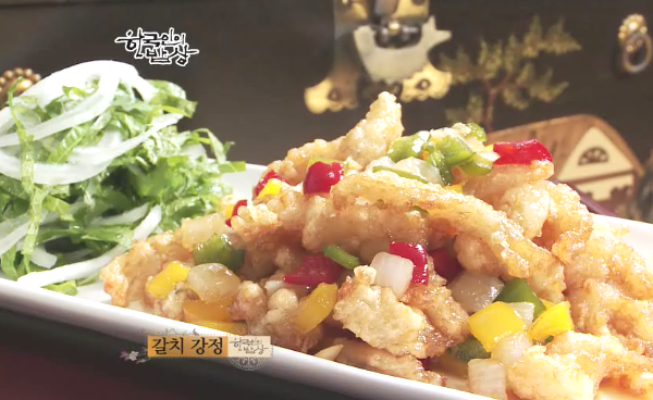 ‘갈치 강정’은 갈치 살을 길게 잘라서 녹말옷을 입혀서 튀깁니다. 그리고 파프리카, 양파, 다진마늘을 기름을 두른 펜에서 볶다가 탕수육소스를 만들어서 넣고 끊이다가 튀긴 갈치를 넣고 볶아줍니다. 갈치는 원래 비린내가 많이 나는 생선인데 이것을 녹말가루에 입혀서 튀겼기 떄문에 비린내가 나지 않아 외국인들이 먹기에도 아주 좋은 영양 간식이랍니다.