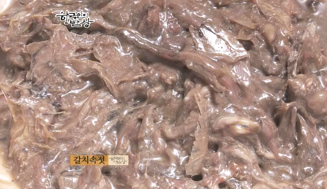 ‘갈치속젓’은 먹을 수 없는 부분만 잘라 버리고 내장, 머리 부분을 모두 칼로 다지고 소금을 뿌려서 주물럭합니다. 그리고 겨울에는 두달 정도 숙성을 시키지만 여름에는 한 달정도면 삭습니다. 잘 삭힌 속젓에 고추 송송, 파 송송, 고춧가루, 고추장, 다진마늘을 넣고 비비면 갈치속젓 양념이 완성됩니다.