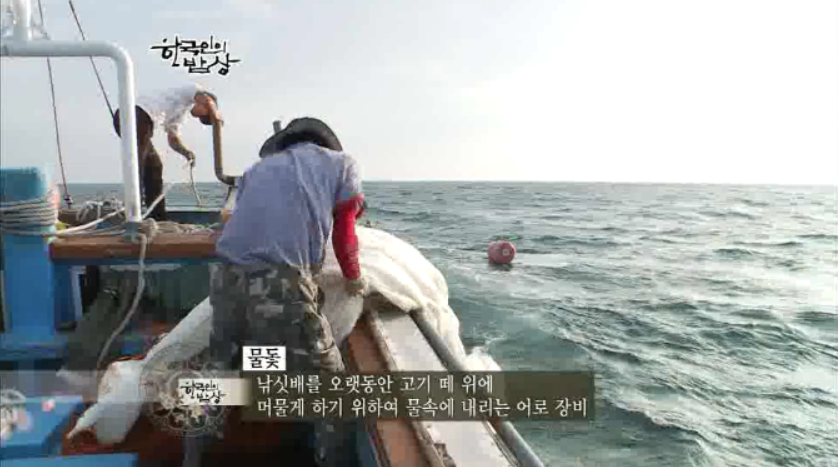 어부는 밤참을 준비합니다. ‘갈치회’는 갓잡은 갈치를 비늘째로 회를 쳐서 먹습니다. 간단한 밑반찬에 컵라면과 함께 먹습니다. 서울로가면 신선도가 많이 떨어져서 회로는 못먹고 구이용이나 찌개용만 된다고 합니다.