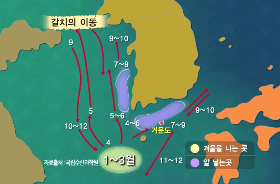 이 계절 유독 거문도에서만 잡히는 이유는 무엇일까요? 회유성 어종인 갈치는 산란을 위해 북상을 하는데 그 때 거문도 어장이 길목이 됩니다.