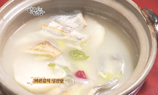 ‘마른갈치 싱건탕’은 쌀뜬물을 냄비에 넣고 무를 깔고 건갈치를 넣고 한소끔 푹 끊입니다. 거기에 파와 고추를 송송썰어 넣고 끊여냅니다.