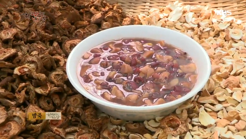 ‘밤죽’은 말린 밤, 잡곡, 말린 돌배를 비벼서 씻은 뒤에 솥에 넣고 고로쇠 수액을 부은 뒤에 푹 끓입니다.