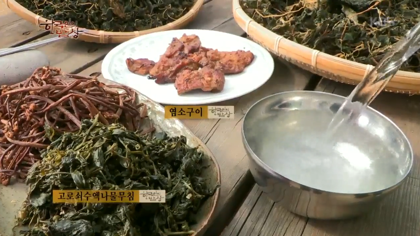 ‘고사리무침’은 삶은 고사리에 간장, 다진마늘, 고로쇠 수액 등을 넣고 주물주물해서 볶아줍니다. 그리고 불고기 양념한 염소고기를 석쇠에 올려 숯불에 구워서 고사리무침과 먹습니다.