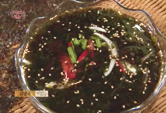 ‘김국(=김장물)’은 마른 김을 펜에 잘 굽고 부수어서 적당히 간을 한 소금물을 부어줍니다. 그리고 고추, 양파, 식초를 넣어서 만듭니다. 미역냉국과 똑같습니다.