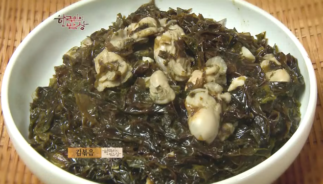 ‘김볶음’은 물에 김을 불립니다. 참기름에 굴을 넣고 볶다가 김을 넣고 볶아도 맛있습니다.