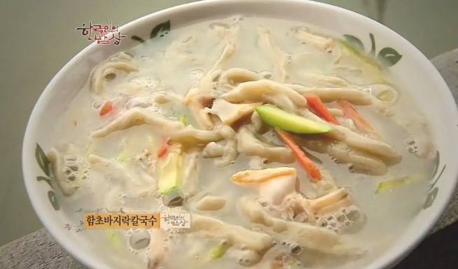 ‘함초바지락칼국수’는 함초를 잘 씻어서 믹서기에 갑니다. 그리고 체에 걸러서 즙을 내리고 밀가루에 즙을 섞어서 칼국수면을 만듭니다. 끊인 물에 바지락살 넣고 육수를 내고 면넣고 애호박, 당근을 넣고 끊입니다.