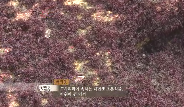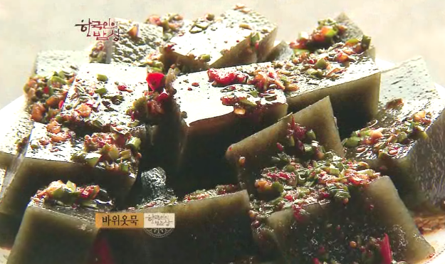 ‘바위옷묵’은 바위옷을 끊는 물에 넣고 계속 젓습니다(안저으면 바로 눌러붙음). 그리고 체에 걸려서 틀에다가 굳히면 됩니다. 탱글탱글한 바위옷묵은 해조류 맛이 그대로 난다고 합니다. 먹기 좋게 설어 간장양념을 뿌려먹습니다.