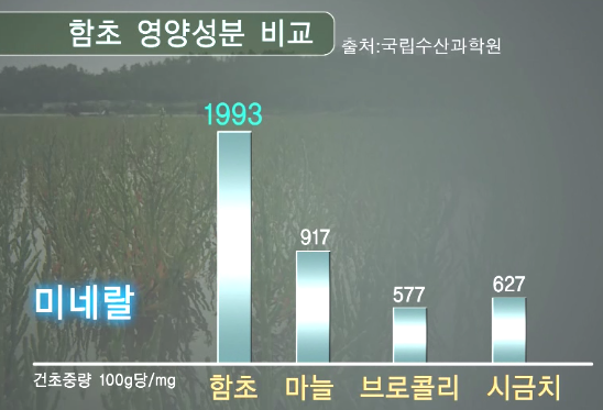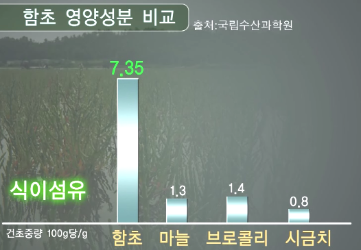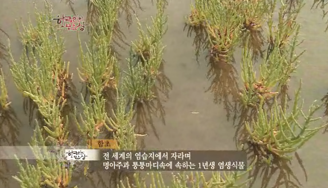 소금밭에서 얻는 것이 하나 더 있는데 ‘함초’입니다. 함초에는 미네랄이 시금치보다 3배 높고 식이섬유는 시금치보다 7배 가량 높습니다. 함초는 소금에도 귀한 역할을 합니다.