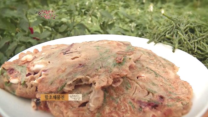 ‘함초해물전’은 함초는 뿌리잘라내고 연한 잎쪽을 골라 잘라서 준비하고 부침물에 새우, 오징어 등 해물과 함초를 넣어 지집니다. 해물파전에 파대신 함초가 들어간다고 보면됩니다.