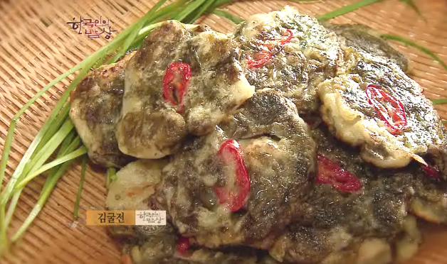 ‘김굴전’은 부침가루에 굴을 데친물로 반죽을 만들고 불린 김과 데친굴, 양파를 넣어 한수저씩 떠서 펜에 지집니다.