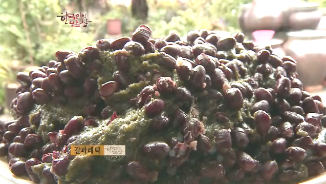 ‘갈파래떡’은 갈파래와 조를 돌절구에 찧어서 시루에 넣은 뒤에 팥을 올려서 쪄냅니다.
