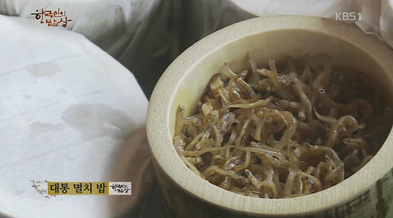 ‘대통멸치밥’은 쌀, 콩, 표고버섯 등을 잘 섞어서 씻어 불린 뒤에 위에 마른소멸치를 참기름, 간장에 볶아서 올려서 한지로 싸서 찜통에 넣어서 쪄줍니다. 간장 양념장에 비벼서 멸치조림과 함께 쌈을 싸서 먹습니다.