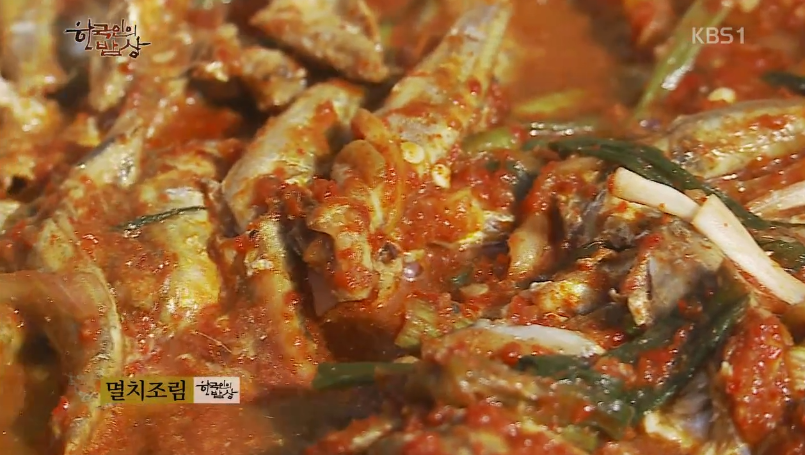 ‘멸치조림’은 내장과 머리를 제거하고 손질해서 냄비에 둘러줍니다. 그리고 간장, 된장, 고춧가루, 다진마늘 등으로 양념을 한 뒤에 위에 올리고 물을 자작하게 붓고 양파, 쪽파, 고추를 올린 뒤에 조려줍니다.