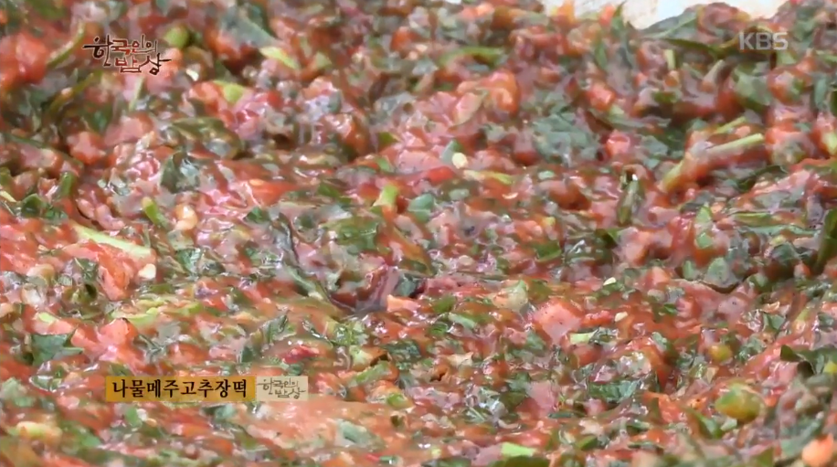 ‘나물메주고추장떡’은 나물을 송송 썰고 고추 송송 썰어 밀가루를 붓고 메주고추장을 넣어 잘 치대 줍니다. 그리고 면보 위에 반죽을 넓게 펴고 솥뚜껑에 묶은 뒤에 밥을 하는 솥을 덮어서 쪄줍니다.