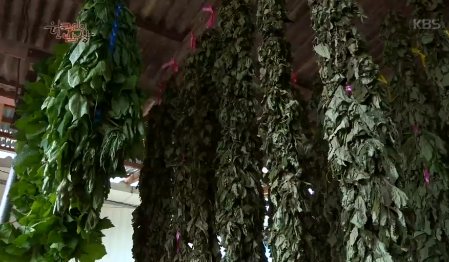 여기서는 나물을 엮어서 바람 잘 통하는 그늘에 매달아서 말립니다.