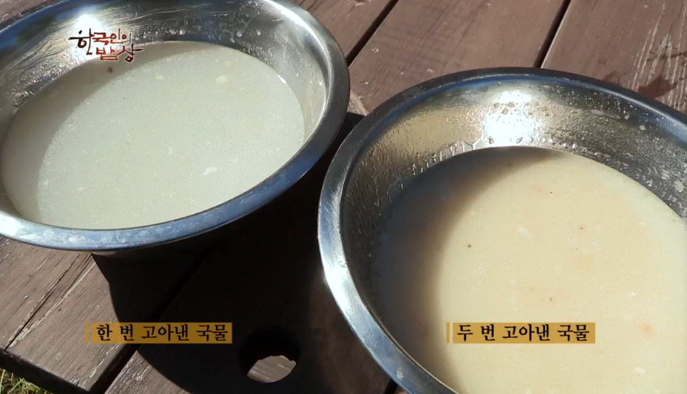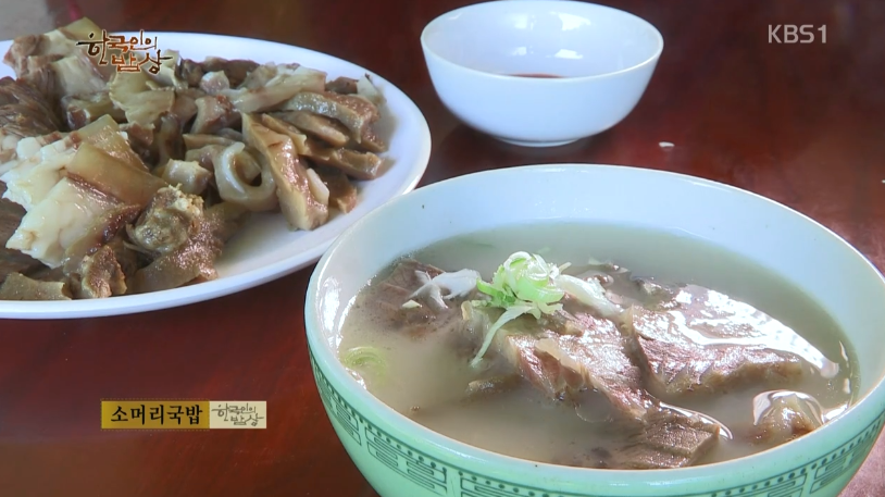 ‘소머리국밥’은 소 뼈를 세 번을 고아서 그 물을 섞어 줍니다. 그리고 잘 삶은 소머리 고기를 먹기 좋게 썰어줍니다. 그릇에 고기를 넣고 국물을 부어줍니다.