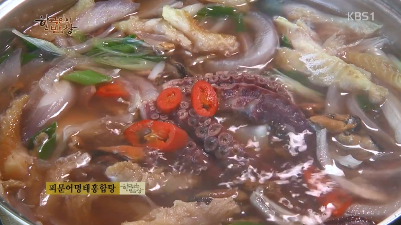 ‘피문어명태홍합탕’은 냄비에 나박하게 무를 썰어 깔고 북어를 열심히 패서 찢은 것, 말린 피문어를 다리 두 개 떼고 넣고 말린홍합, 양파채, 파, 고추 등을 넣고 육수를 넣고 끓입니다. 뜨거울 때도 먹고 식혀서도 먹는다고 합니다.