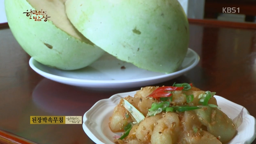 ‘된장박속무침’은 박을 반으로 쪼개서 물 자작하게 붓고 푹 삶아줍니다. 그리고 속을 수저로 한 입크기로 떠내서 다진파, 깨, 다진마늘, 고추, 된장 등을 넣어서 무쳐줍니다.