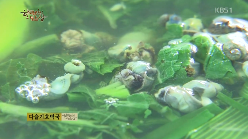 ‘다슬기호박국’은 멸치다싯물에 다슬기를 삶아 살만 골라내서 넣고 애호박의 씨를 빼고 나박하게 썰어 넣고 호박잎을 박박문질러 씻어서 그냥 막 찢어 넣어 끓여줍니다.