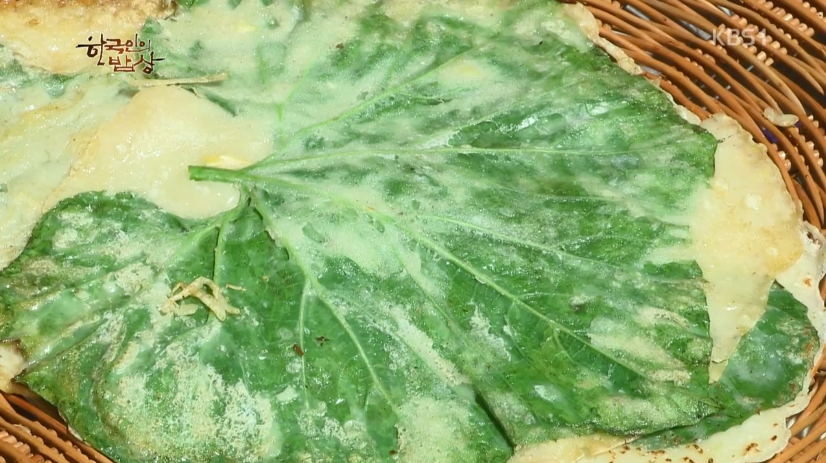 ‘박잎부침개’는 솥뚜껑에 기름을 두르고 부침개반죽을 두르고 박잎을 올린 뒤에 구워줍니다.