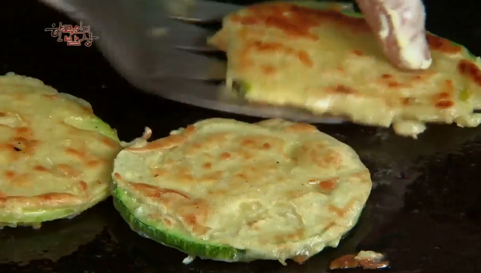‘청둥호박속전’은 청둥호박을 반을 갈라 씨를 발라내고 속은 채로 긁어 내서 밀가루 반죽을 섞어줍니다. 그리고 팬에 기름을 두르고 반죽을 올려서 부쳐줍니다.