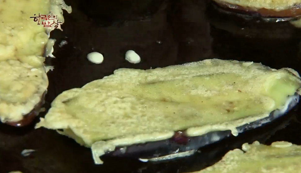 ‘가지, 애호박전’은 가지, 애호박을 길게 얇게 썰어서 얇게 전 반죽을 묻혀서 구워줍니다.