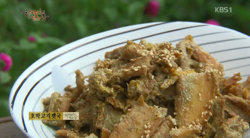 ‘호박고지깻국’은 늙은 호박의 껍질을 다 벗기고 위부터 돌돌 깎아서 널어서 말립니다. 겨울에 눈 맞으면서 말리면 더 맛있다고 합니다. 그리고 말린 호박고지를 먹기 좋게 썰어 참기름을 두르고 볶아줍니다. 그리고 물을 자작하게 붓고 끓이다가 마지막에 들깨가루를 둘러 조려줍니다.