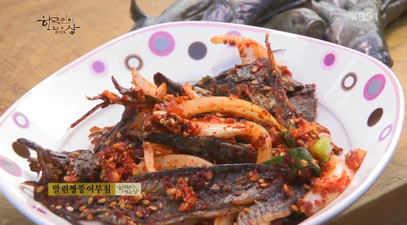 ‘말린짱뚱어무침’은 짱뚱어를 말린 뒤에 두들겨서 찢은 뒤에 다진마늘, 양파, 파, 참기름, 고춧가루, 깨소금 넣고 무쳐줍니다.