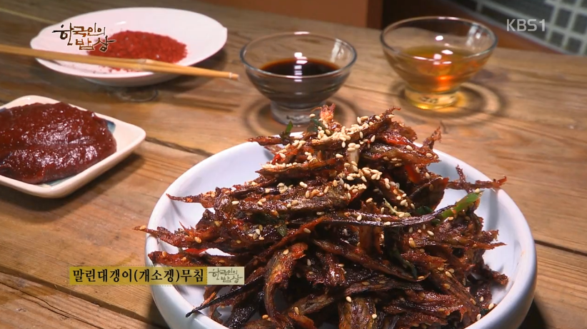 ‘말린대갱이무침’은 대갱이는 잡아오면 바로 손질해서 말려 줍니다. 그리고 두들겨서 찢은 뒤에 고춧장, 간장, 깨소금 등을 넣고 잘 무쳐줍니다.