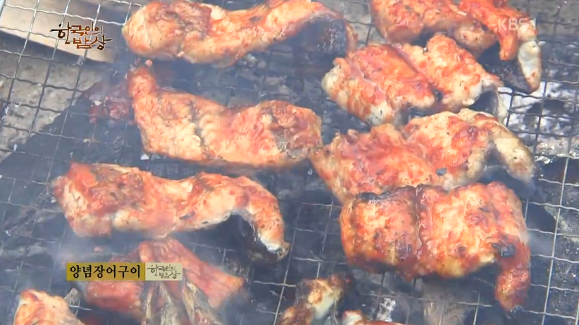 ‘양념장어구이’는 민물장어를 손질해서 포를 떠줍니다. 갈대 뿌리를 손질해서 잘 씻은 뒤에 체반에 말립니다. 솥에 물을 붓고 끓으면 말린 뿌리를 넣고 끓입니다. 갈대뿌리물에 고추장, 간장, 고춧가루, 다진마늘, 다진 파, 물엿 등을 넣고 양념을 만듭니다. 석쇠에 장어를 올려 살짝 굽고 양념을 발라 한 번 더 구워줍니다.
